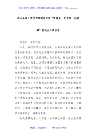 / 在全县深入贯彻作风建设专题“听意见、改作风、办实事”座谈会上的讲话