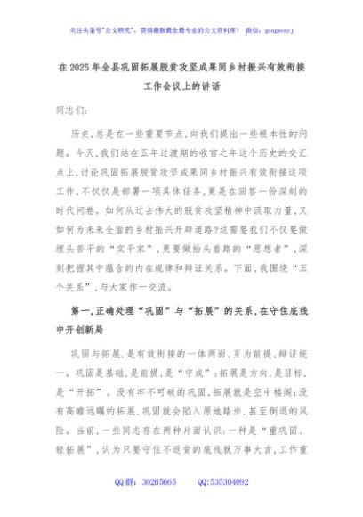 / 在2025年全县巩固拓展脱贫攻坚成果同乡村振兴有效衔接工作会议上的讲话