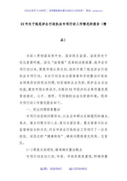 / XX市关于规范涉企行政执法专项行动工作情况的报告(精品)