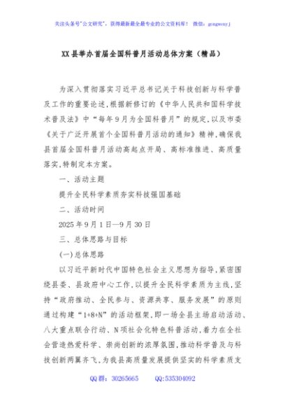 / XX县举办首届全国科普月活动总体方案(精品)