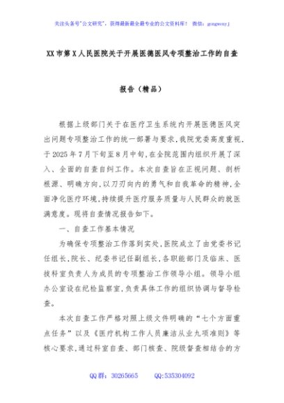 / XX市第X人民医院关于开展医德医风专项整治工作的自查报告(精品)