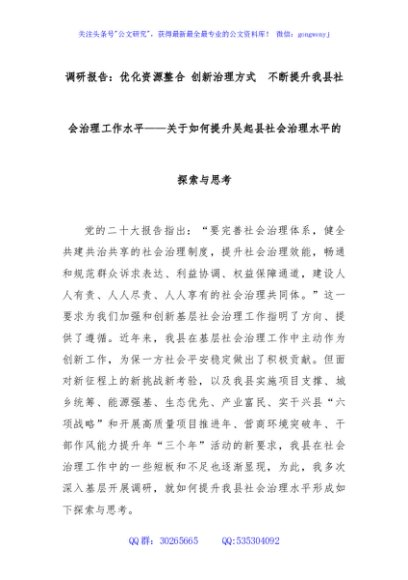 / 调研报告:优化资源整合 创新治理方式 不断提升我县社会治理工作水平——关于如何提升吴起县社会治理水平的探索与思考