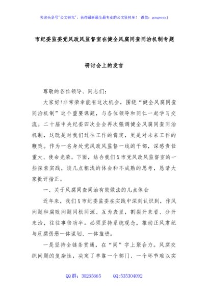 / 市纪委监委党风政风监督室在健全风腐同查同治机制专题研讨会上的发言