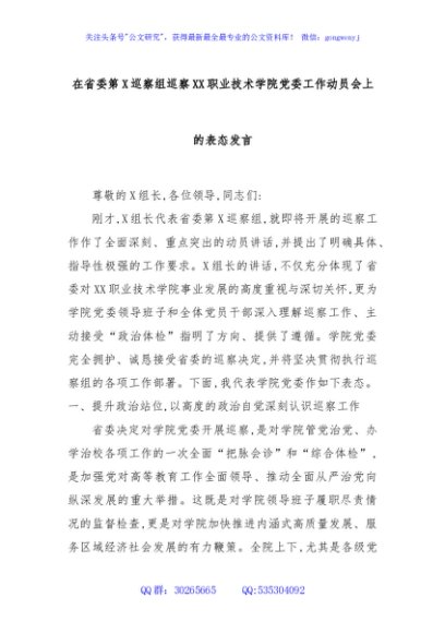 / 在省委第X巡察组巡察XX职业技术学院党委工作动员会上的表态发言