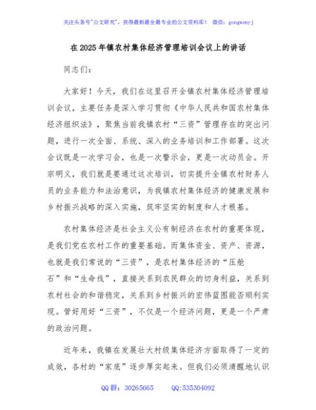 / 在2025年镇农村集体经济管理培训会议上的讲话