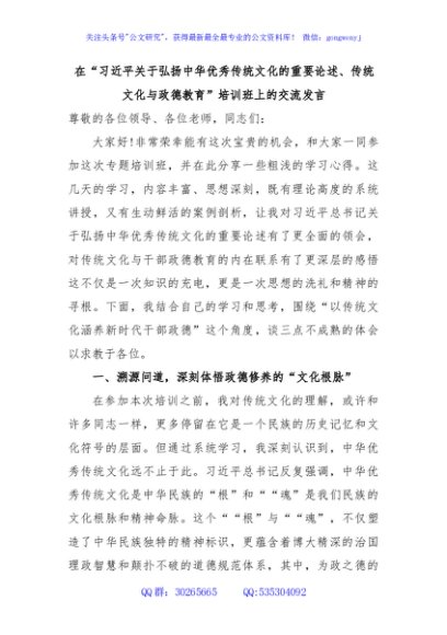 / 在“习近平关于弘扬中华优秀传统文化的重要论述、传统文化与政德教育”培训班上的交流发言