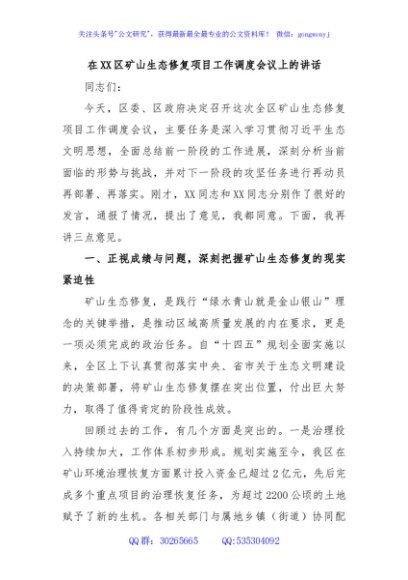 / 在XX区矿山生态修复项目工作调度会议上的讲话