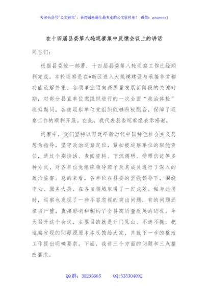/ 在十四届县委第八轮巡察集中反馈会议上的讲话