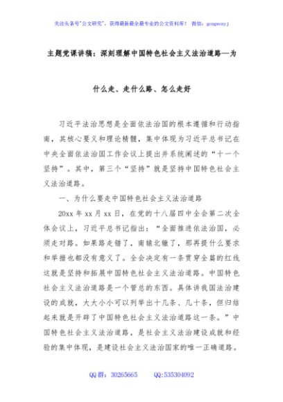 / 主题党课讲稿:深刻理解中国特色社会主义法治道路—为什么走、走什么路、怎么走好
