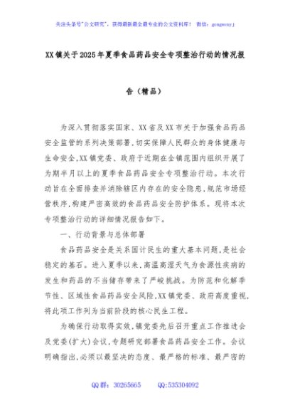 / XX镇关于2025年夏季食品药品安全专项整治行动的情况报告(精品)