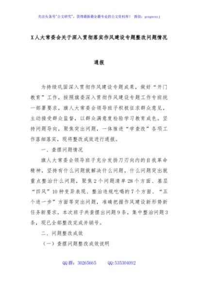 / X人大常委会关于深入贯彻落实作风建设专题整改问题情况通报