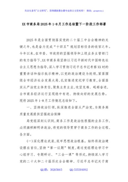 / XX市商务局2025年1-8月工作总结暨下一阶段工作部署