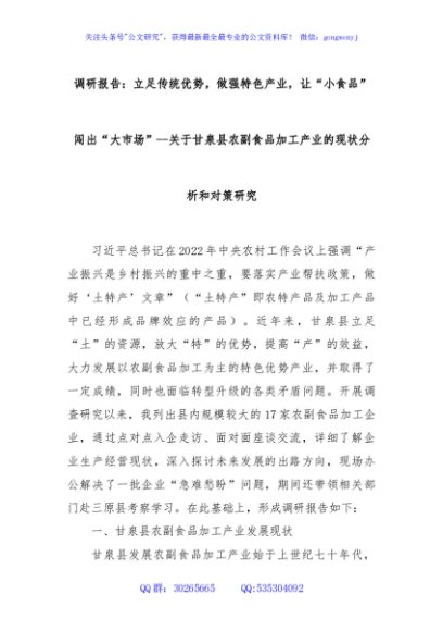 / 调研报告:立足传统优势,做强特色产业,让“小食品”闯出“大市场”--关于甘泉县农副食品加工产业的现状分析和对策研究