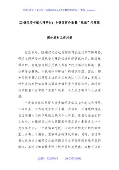 / XX镇纪委书记心得研讨:乡镇信访件数量“逆差”问题原因分析和工作对策