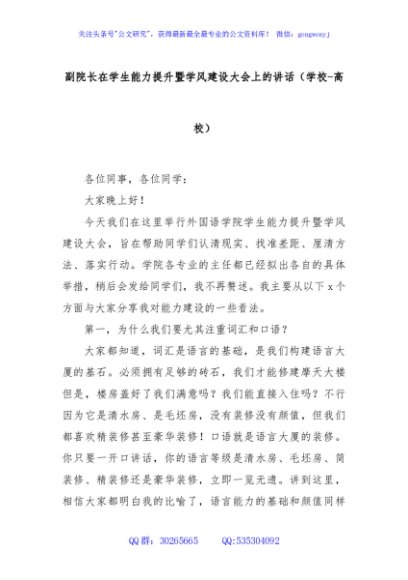 / 副院长在学生能力提升暨学风建设大会上的讲话(学校-高校)