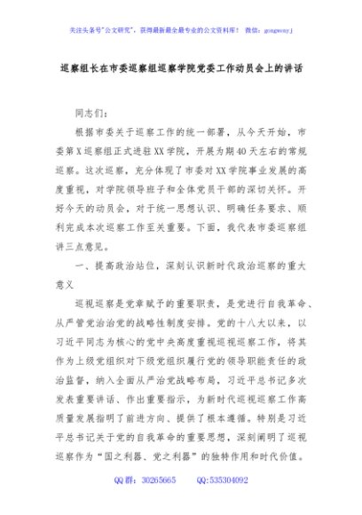 / 巡察组长在市委巡察组巡察学院党委工作动员会上的讲话