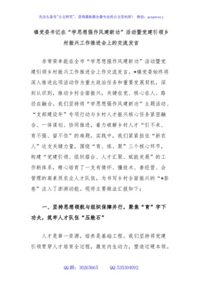 / 镇党委书记在“学思想强作风建新功”活动暨党建引领乡村振兴工作推进会上的交流发言
