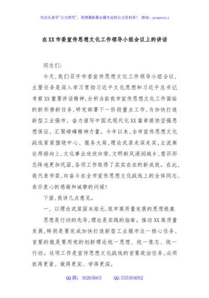 / 在XX市委宣传思想文化工作领导小组会议上的讲话