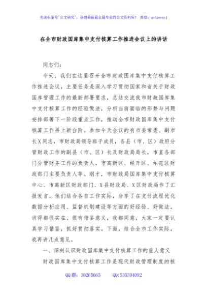 / 在全市财政国库集中支付核算工作推进会议上的讲话