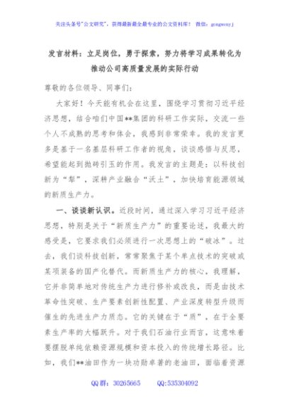 发言材料:立足岗位,勇于探索,努力将学习成果转化为推动公司高质量发展的实际行动