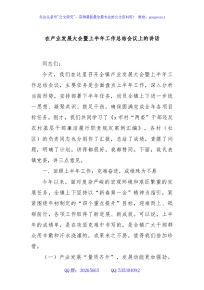 / 在产业发展大会暨上半年工作总结会议上的讲话