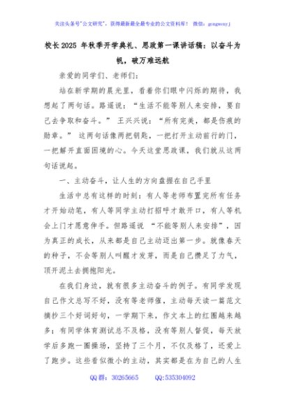 / 校长2025 年秋季开学典礼、思政第一课讲话稿:以奋斗为帆,破万难远航