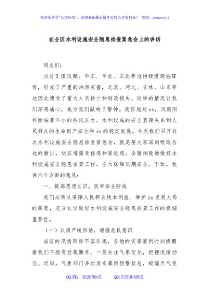 / 在全区水利设施安全隐患排查紧急会上的讲话