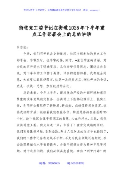/ 街道党工委书记在街道2025年下半年重点工作部署会上的总结讲话