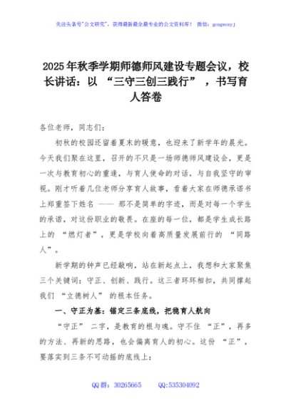 / 2025年秋季学期师德师风建设专题会议,校长讲话:以 “三守三创三践行” ,书写育人答卷