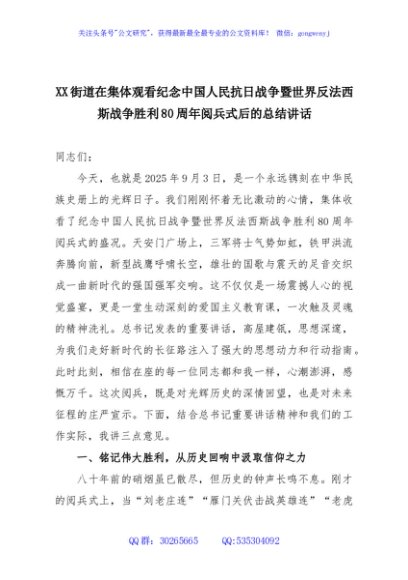 XX街道在集体观看纪念中国人民抗日战争暨世界反法西斯战争胜利80周年阅兵式后的总结讲话