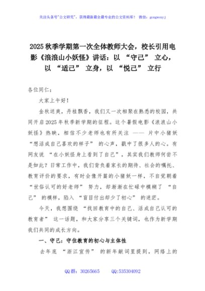 2025秋季学期第一次全体教师大会,校长引用电影《浪浪山小妖怪》讲话:以 “守己” 立心,以 “适己” 立身,以 “悦己” 立行