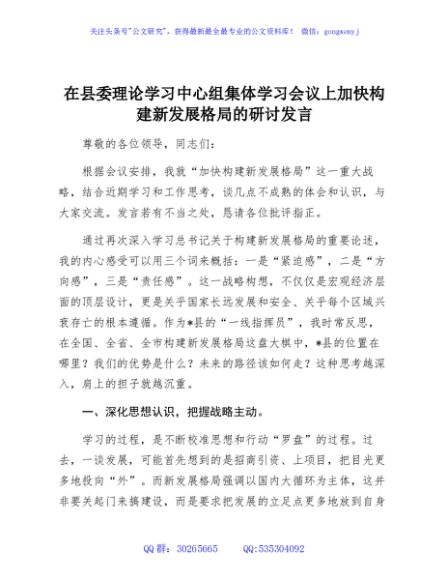 / 在县委理论学习中心组集体学习会议上对加快构建新发展格局的研讨发言