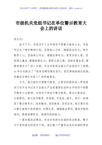 / 市级机关党组书记在单位警示教育大会上的讲话