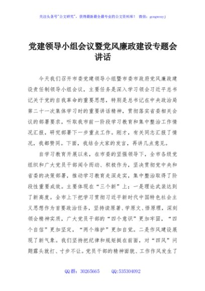 / 党建领导小组会议暨党风廉政建设专题会讲话
