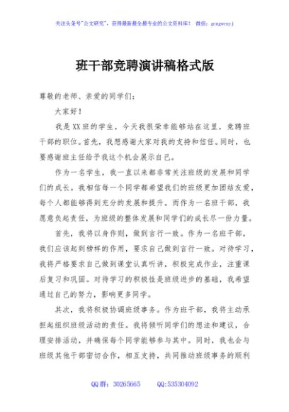 班干部竞聘演讲稿格式版