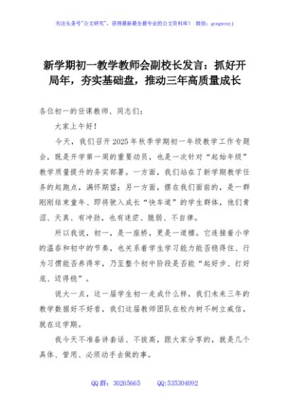 / 新学期初一教学教师会副校长发言:抓好开局年,夯实基础盘,推动三年高质量成长