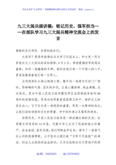 / 九三大阅兵演讲稿:铭记历史,强军担当——在部队学习九三大阅兵精神交流会上的发言