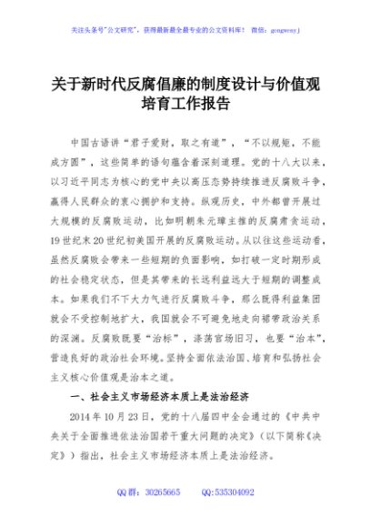 关于新时代反腐倡廉的制度设计与价值观培育工作报告