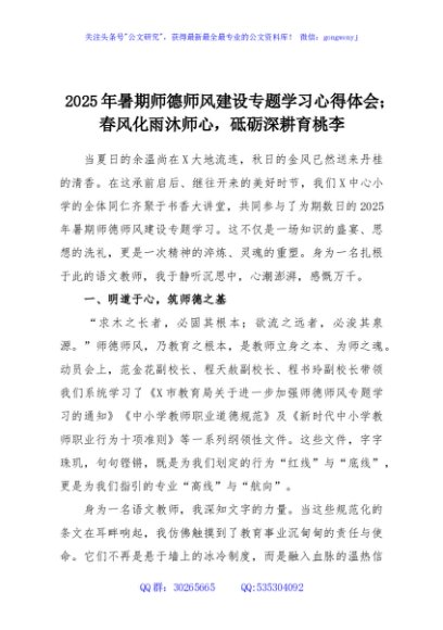 / 2025年暑期师德师风建设专题学习心得体会;春风化雨沐师心,砥砺深耕育桃李