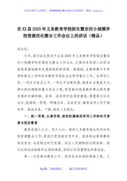 / 在XX县2025年义务教育学校招生暨农村小规模学校资源优化整合工作会议上的讲话(精品)