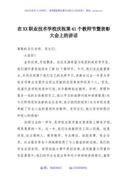 / 在XX职业技术学校庆祝第41个教师节暨表彰大会上的讲话
