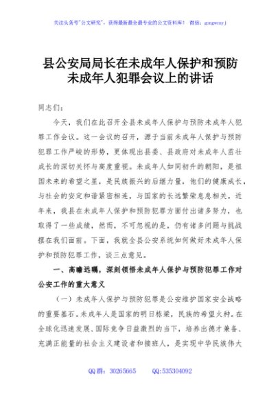 / 县公安局局长在未成年人保护和预防未成年人犯罪会议上的讲话