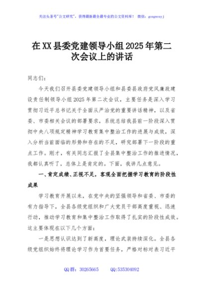 / 在XX县委党建领导小组2025年第二次会议上的讲话