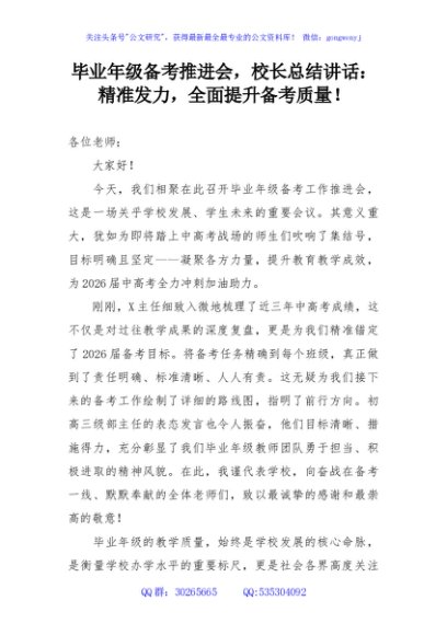毕业年级备考推进会,校长总结讲话:精准发力,全面提升备考质量!