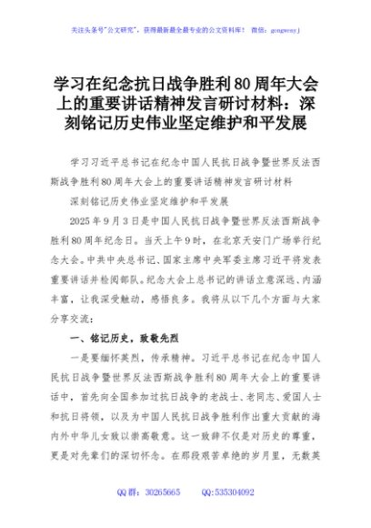 / 学习在纪念抗日战争胜利80周年大会上的重要讲话精神发言研讨材料:深刻铭记历史伟业坚定维护和平发展