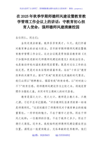 / 在2025年秋季学期师德师风建设暨教育教学管理工作会议上的讲话:守教育初心担育人使命,强师德师风建清廉校园
