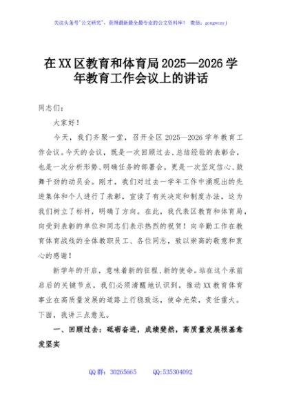 / 在XX区教育和体育局2025—2026学年教育工作会议上的讲话
