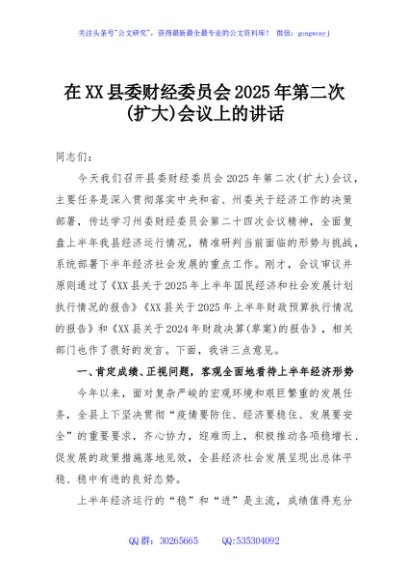 / 在XX县委财经委员会2025年第二次(扩大)会议上的讲话