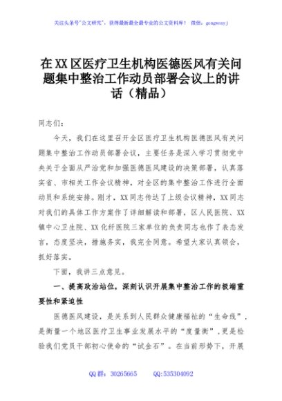 / 在XX区医疗卫生机构医德医风有关问题集中整治工作动员部署会议上的讲话(精品)
