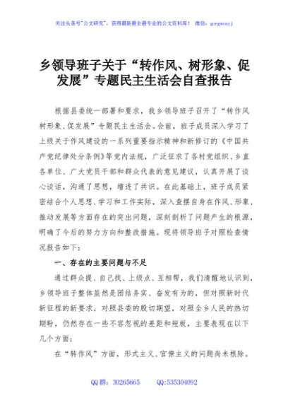 / 乡领导班子关于“转作风、树形象、促发展”专题民主生活会自查报告